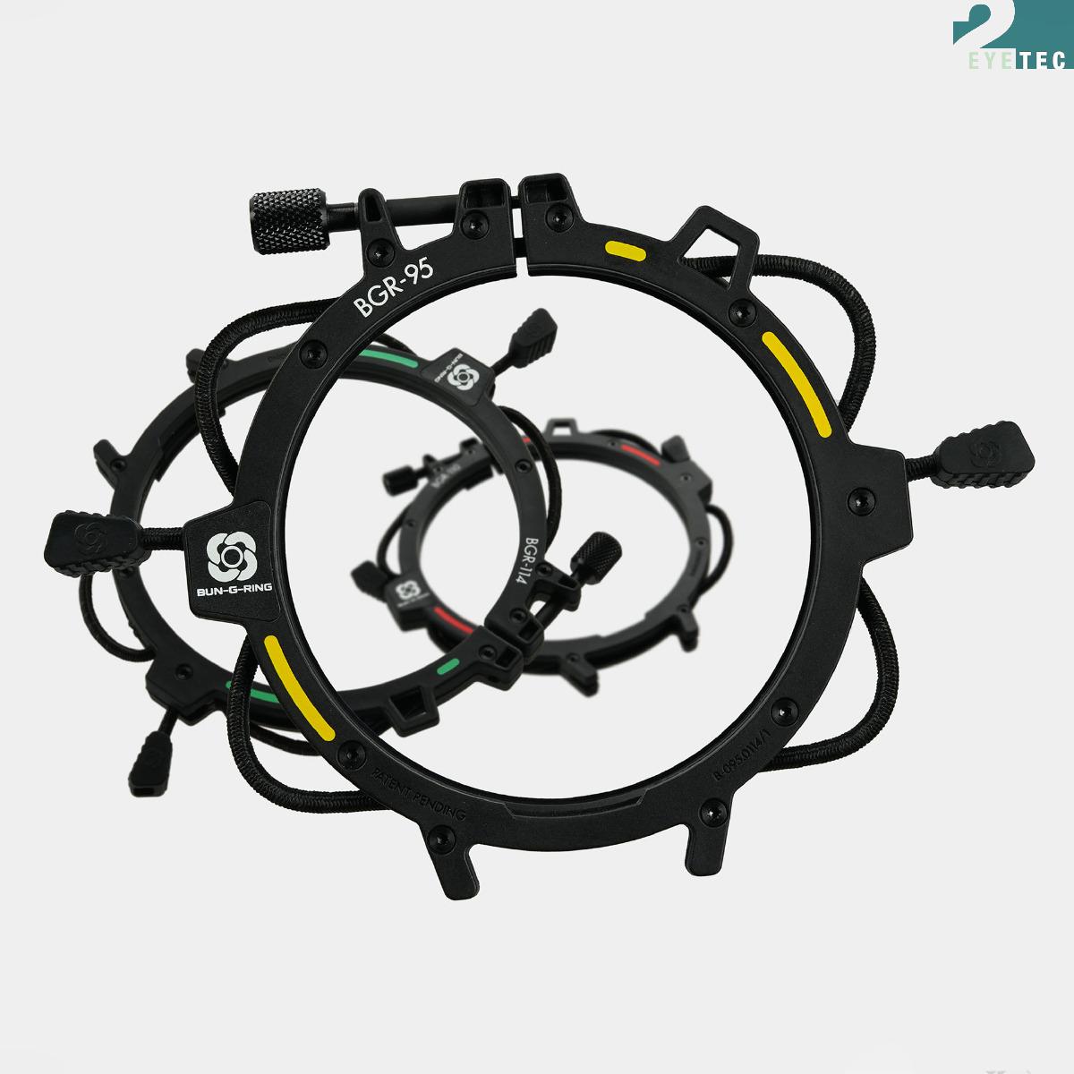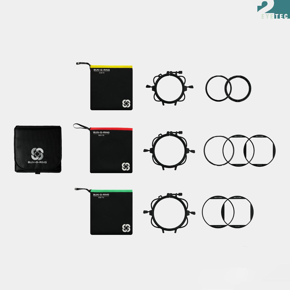 The set includes three Bun-G-Ring mounts for different lens sizes, several adapters for additional diameters, as well as light-blocking inserts to prevent unwanted reflections and stray light.